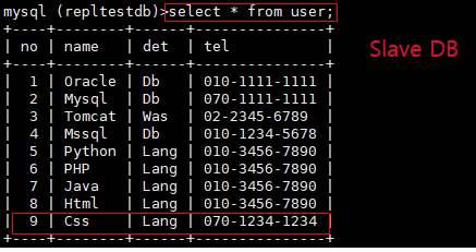 mysql>insert into user(no,name,det,tel) values(9,'Css','Lang'.'070-1234-1234');